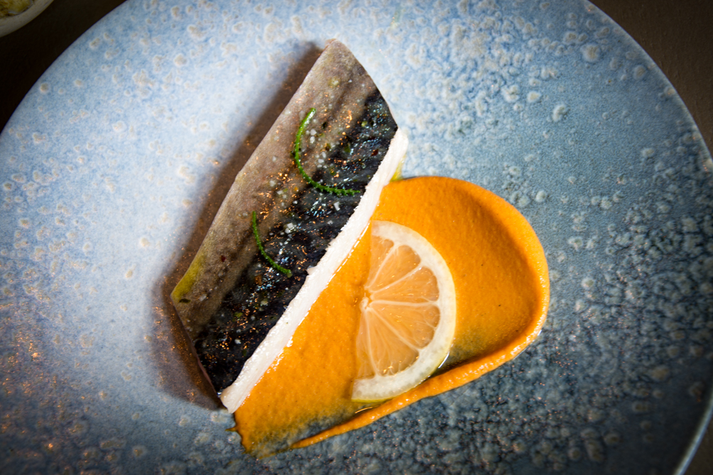 Met appel en gember gepekelde makreel filet, puree van rode paprika, ui, limoen en bouillon van makreel…