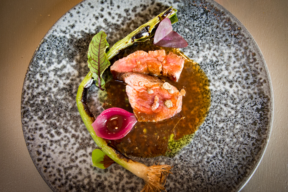 Denversteak met kappertjesboter. Daaronder een biscuit van blauwe kaas, crème van zwarte knoflook en bbq babyprei van het dak…