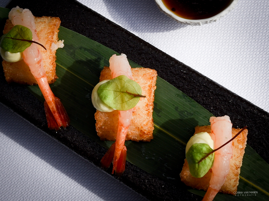 Verrukkelijk!! Tataki van Yellowfin tonijn met Hollandse garnalen, watermeloen, wasabi, sereh, limoenblad en enoki. Een plaatje om te zien en heerlijk om te eten!