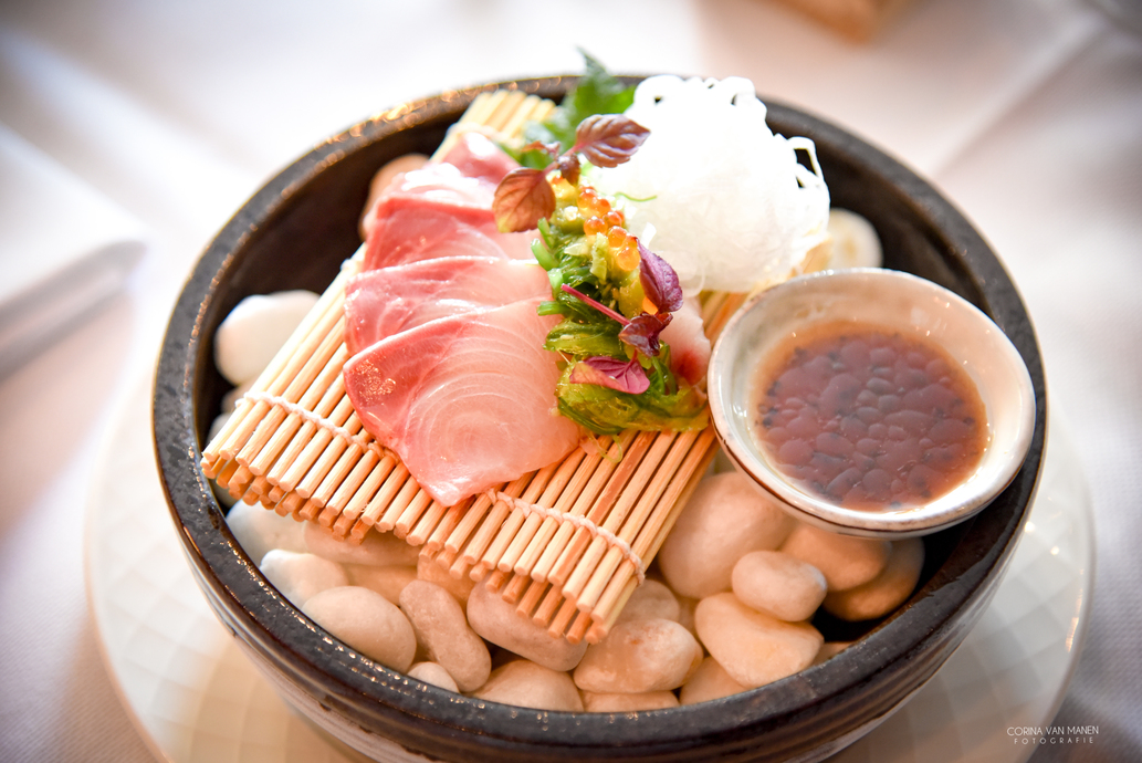Het eerste gerecht met de Kingfish wordt begeleid door een glaasje Nabeshima Junmani Sake.
